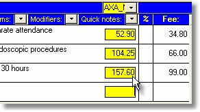 | 2. | Select a health fund from the yellow drop-down list on the Items page. The default for new accounts is 'None'. The system will search the relevant fund table and insert the fee for each item alongside the standard MBS fee. The fund fee is shown in a yellow box. |